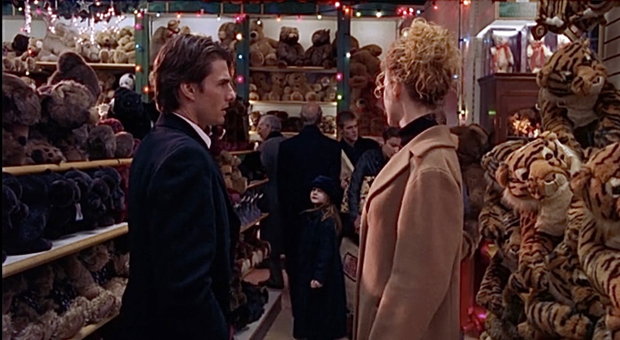But Kubrick’s main point keeps on mounting when Bill, his wife, and his little girl stop in the middle of a toy store directly beside a display of at least 10 stuffed toy tigers like Domino’s, signifying a link between prostitutes and children in the film. And directly afterwards, Bill’s daughter, Helena (Madison Eginton), follows the two men in the background around the corner of the aisle, and that’s the last we see of her. That wouldn’t seem too odd, but these two men were also seen early on in the movie at Victor’s party. Add all that up and it’s curious why these two men showed up in the background at a toy store and exited the scene with Bill’s little girl at their heels.